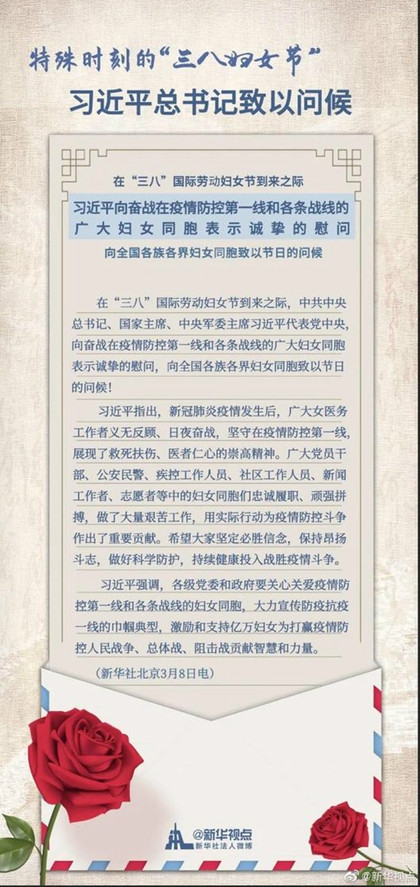 在“三八”国际妇女节到来之际,习近平总书记代表党中央,向奋战在疫情防控第一线和各条战线的广大妇女同胞表示诚挚慰问,向各族各界妇女同胞致以节日问候,充分肯定广大妇女在抗击新冠肺炎疫情中作出的重要贡献,对广大妇女持续投入战胜疫情斗争提出殷切期望。为认真学习贯彻习近平总书记重要指示精神,今天,全国妇联、中国女医师协会发出倡议,号召奋战在疫情防控第一线的女医务工作者牢记习近平总书记重要指示,坚定必胜信念,保持昂扬斗志,做好科学防护,为打赢疫情防控人民战争、总体战、阻击战贡献智慧和力量。