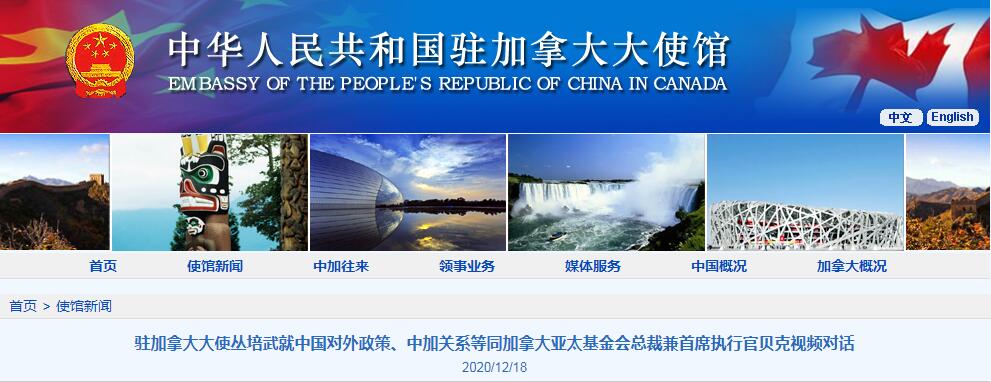 海外网12月18日电 据中国驻加拿大大使馆网站消息,12月15日,丛培武大使同加拿大亚太基金会总裁兼首席执行官贝克举行视频对话会,就中国对外政策、中加关系等议题进行交流。对话主要内容如下: