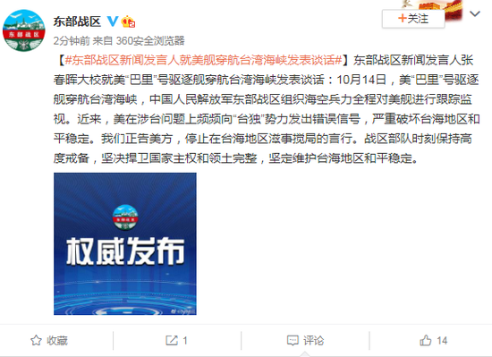 东部战区新闻发言人张春晖大校就美“巴里”号驱逐舰穿航台湾海峡发表谈话:10月14日,美“巴里”号驱逐舰穿航台湾海峡,中国人民解放军东部战区组织海空兵力全程对美舰进行跟踪监视。近来,美在涉台问题上频频向“台独”势力发出错误信号,严重破坏台海地区和平稳定。我们正告美方,停止在台海地区滋事搅局的言行。战区部队时刻保持高度戒备,坚决捍卫国家主权和领土完整,坚定维护台海地区和平稳定。